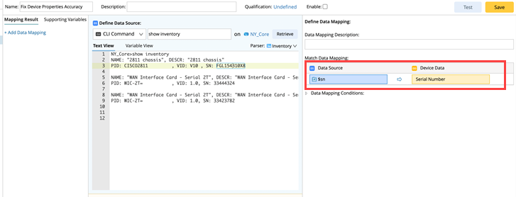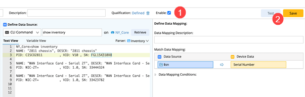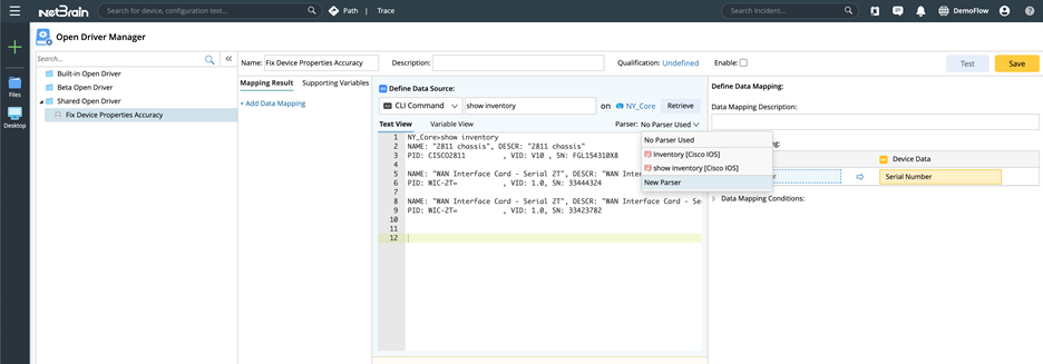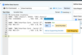 Example: Select CLI Command> Enter show inventory> Click Retrieve> Create a new parser Inventory
