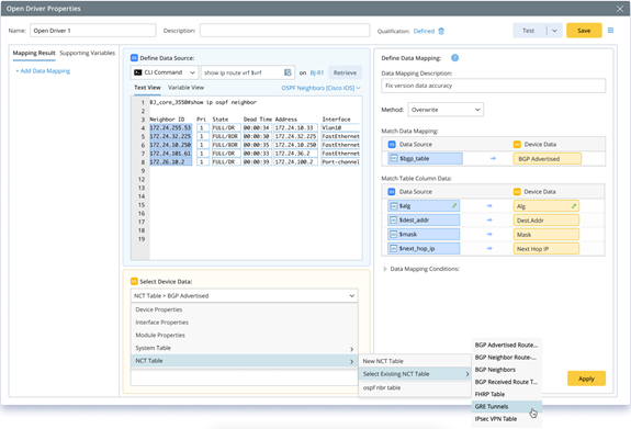 Open Driver can modify an existing NCT table and create a new NCT table. Only the global NCT table (not VRF or subtables) is supported.