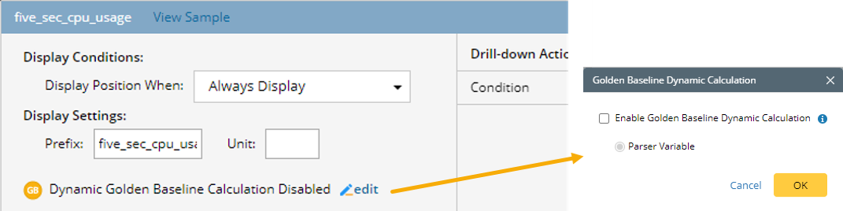 | Dynamic Golden Baseline Calculation Enabled | Enable or disable the dynamic golden baseline calculation for the variable. The following is a sample screenshot: Note: This setting only applies to parser variables. |