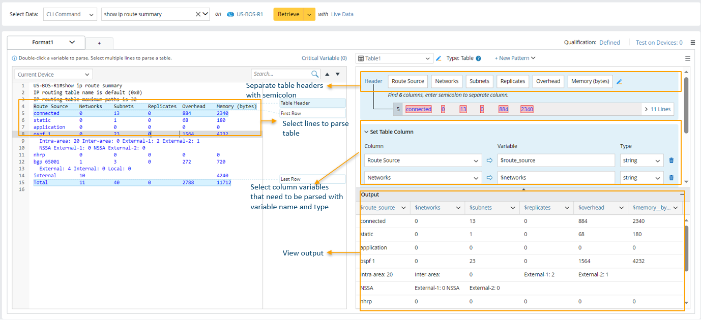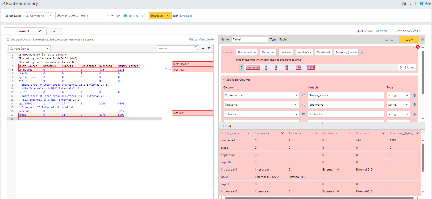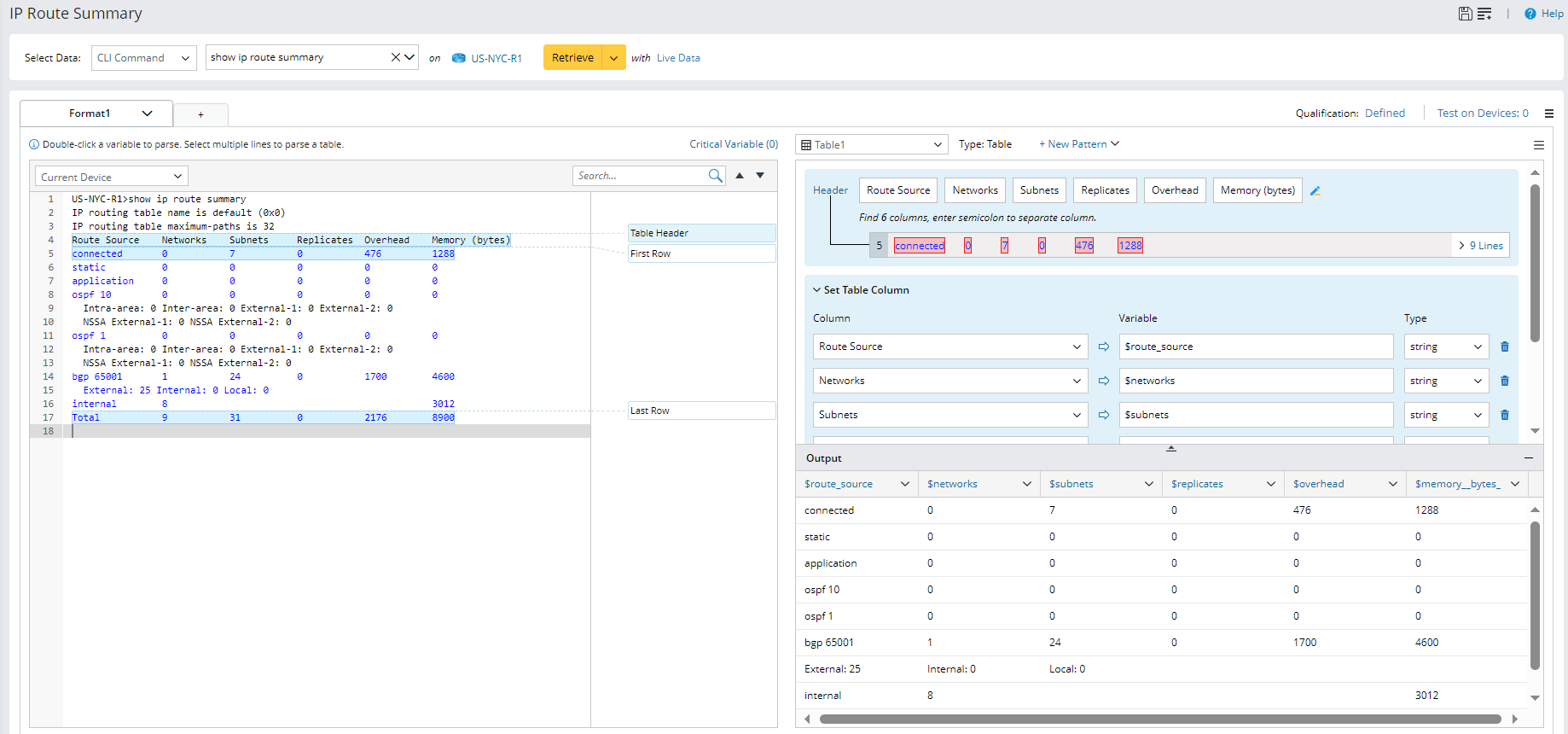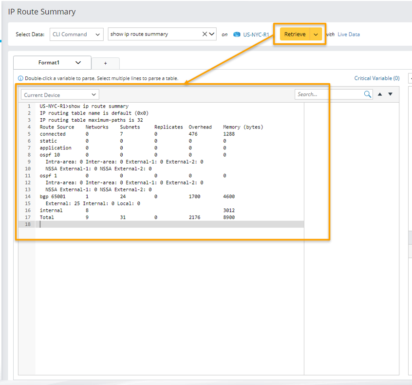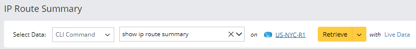 icon, then name the parser "IP Route Summary") and the definitions for collecting CLI command data. in this example, we will retrieve CLI command data of the command "show ip route summary" on the device US-NYC-R1.