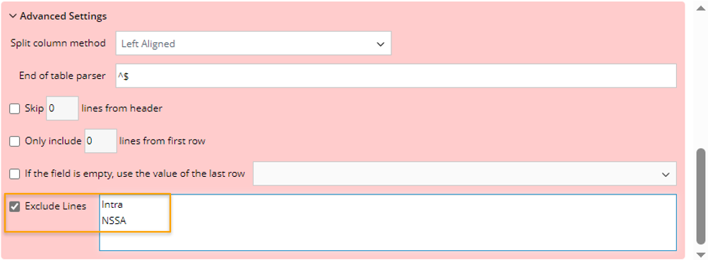 icon to remove a unnecessary table column. - In Advanced Settings block, define more settings to make refinement. For example, select the Exclude Lines options, then enter "Intra" and "NSSA" to exclude lines 9-10 from the scope of texts to be parsed.