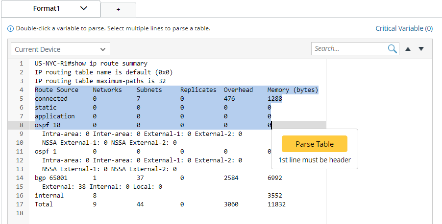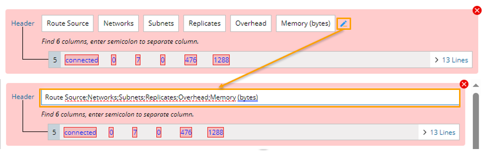 Table Parser parses table-formatted text, such as NDP table, VRF table, OSPF neighbors, etc. With the Table Parser, you can address the line of table headers in the raw text and then use the column separator to manually adjust the table column.
