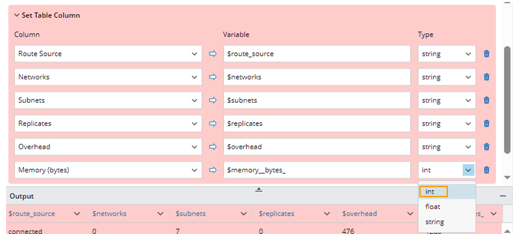 - In the Set Table Column block, select variables required to parse, rename the column and select the variable types. For example, you can change variable type of Memory (bytes) from "string" to "int".