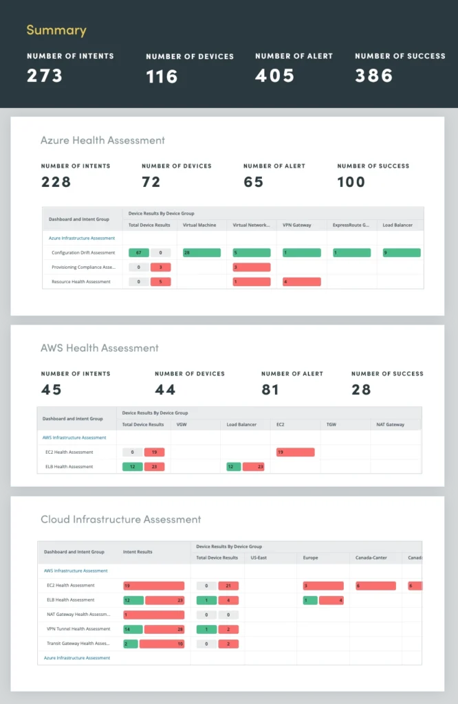 By applying automation to hybrid-cloud network assessment, you can continuously monitor and assess your cloud networks across multiple cloud providers, including Microsoft Azure, Amazon AWS, and Google Cloud for insights into: