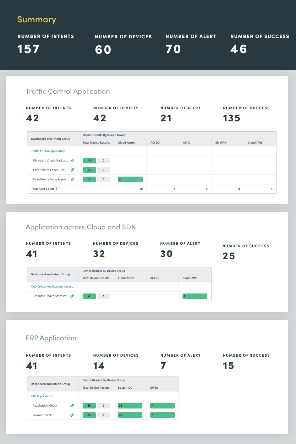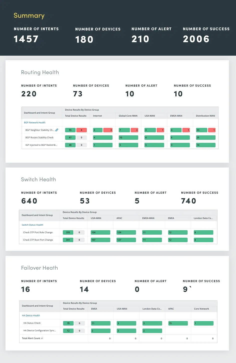 NetBrain offers a library of common enterprise network assessments as a foundation, while its no-code platform lets you customize and expand these templates to fit your unique environment. Results are easily visualized and shared through widget-based summary dashboards, empowering your team with real-time network insights.