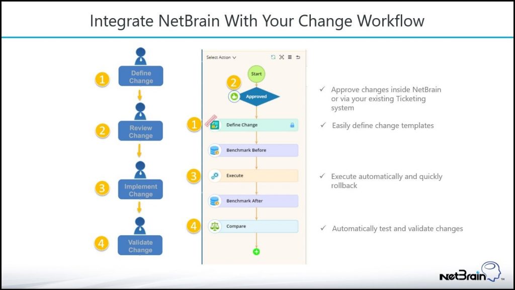 NetBrain fits in very well here, too. Network Intents (sometimes called Runbooks) are NetBrain’s built-in capabilities for describing and automatically executing expected network operations.