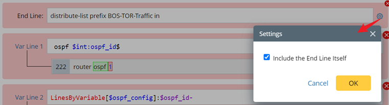 - Parse Line Settings: Set name to “ospf_config”, select “The line between”, then select “$ospf_id” and “End”. Check the parsed lines in the output.