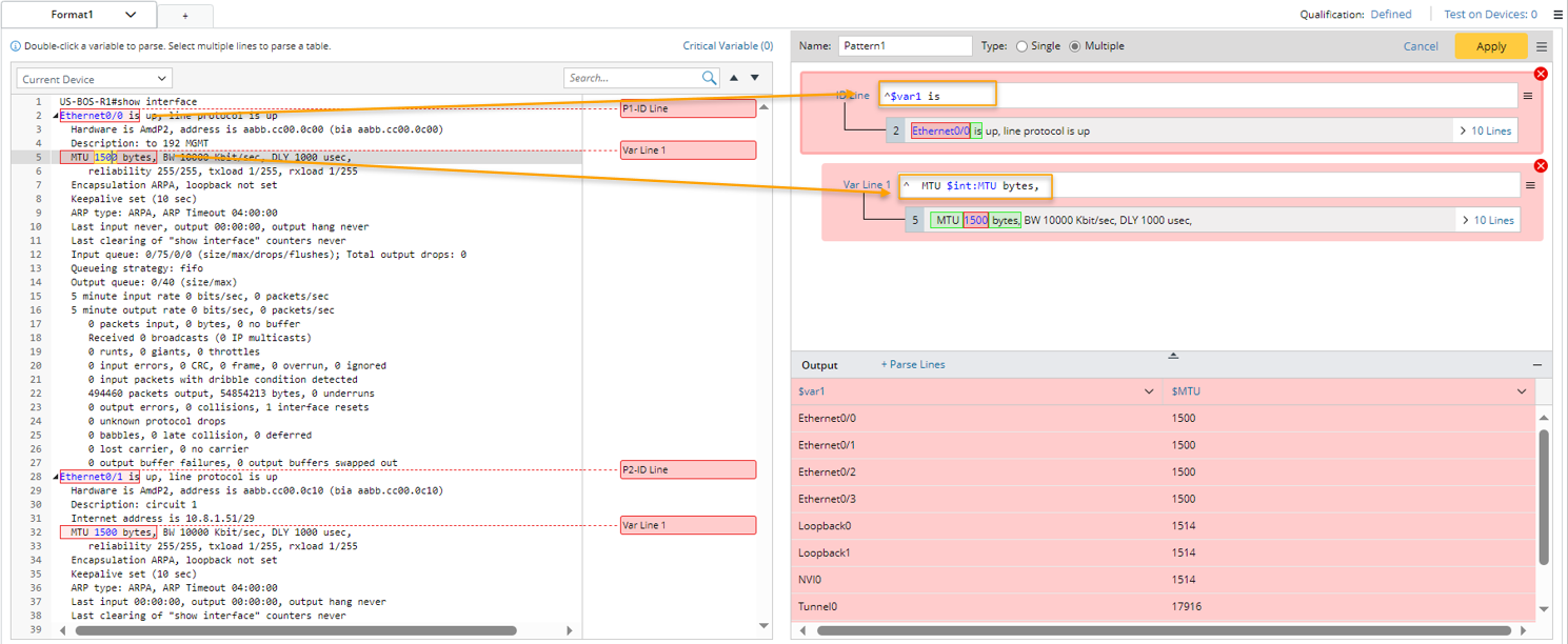 - Click "Ethernet0/0" in line 2, then continue to click "1500" in line 5 to parse the variables “interface” and “MTU” first in the Auto Parser mode.