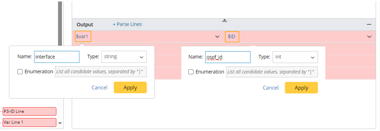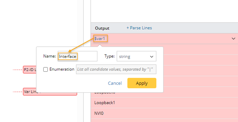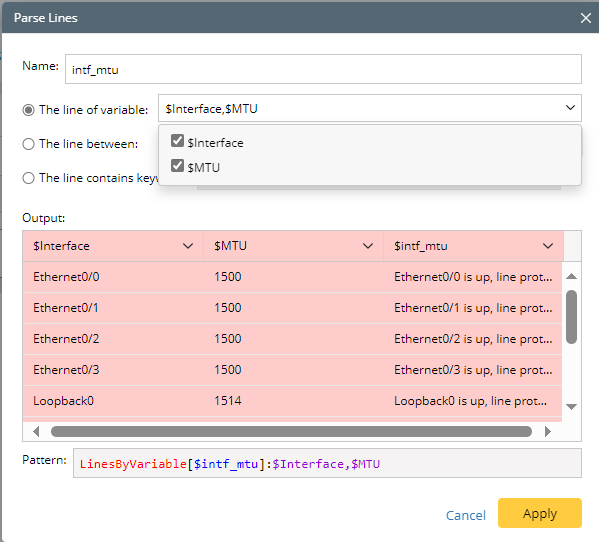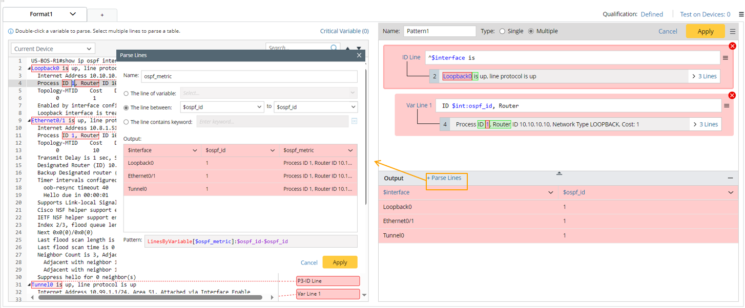 - Click +Parse Lines, then define Parse Lines settings in the pop-up dialog: Set the name to “ospf_metric”. Select The line between option, then select “$interface” and “$ospf_id” to define the scope of the matched original lines. Check the parsed lines between the two selected variables for each interface in the output.