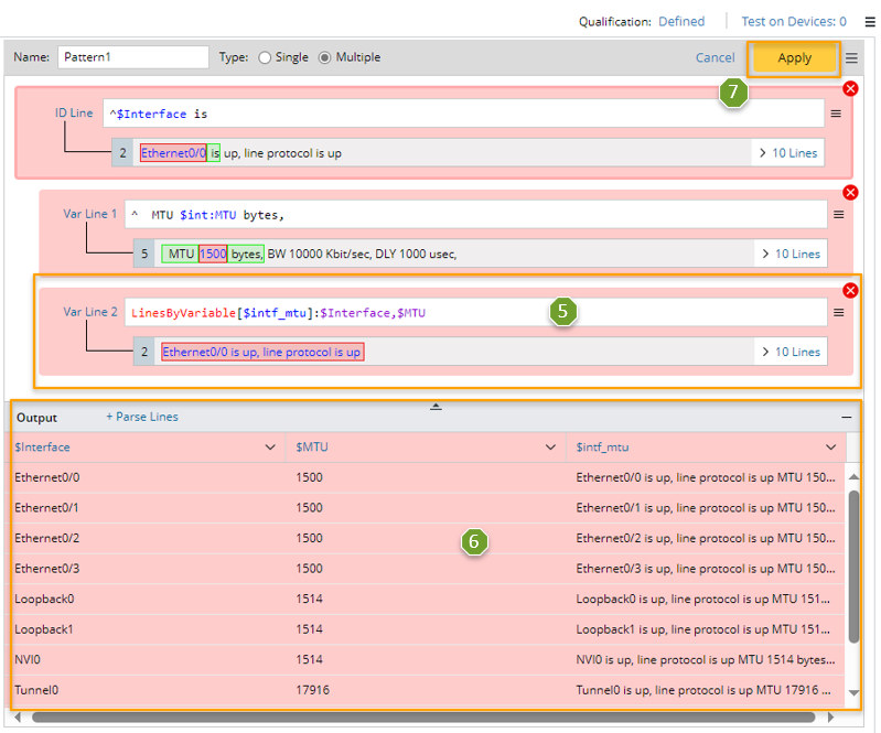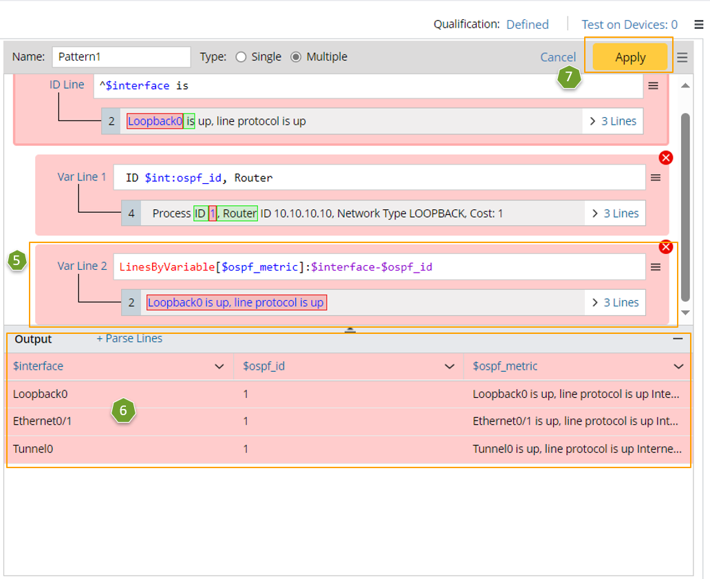 - Select “The line between”, then select “$interface” and “$ospf_id” to define the scope of the matched original lines. Check the parsed lines between the two selected variables for each interface in the output.