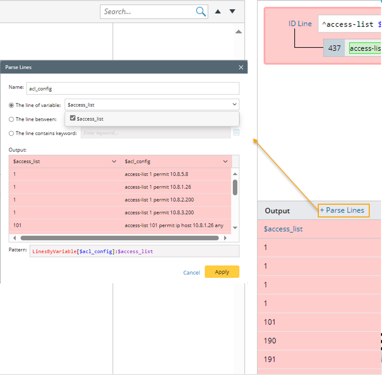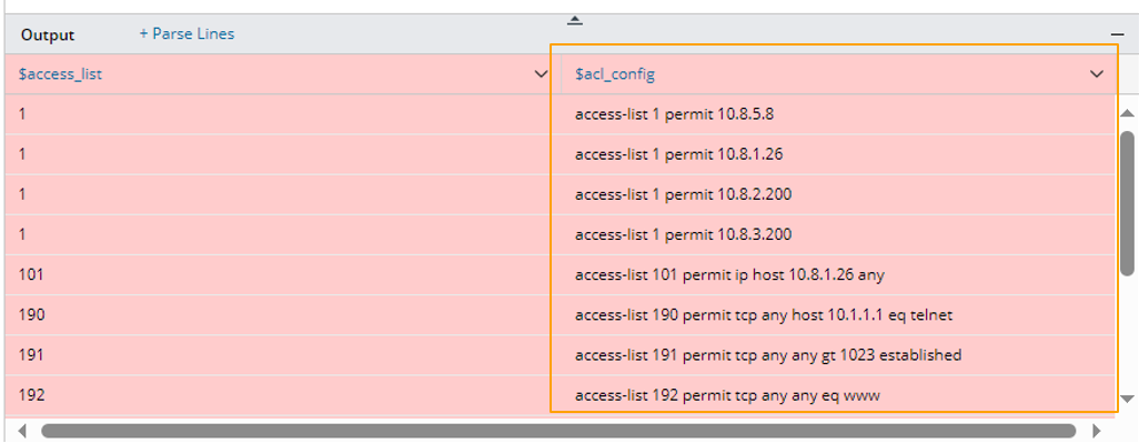 - Parse Line Settings: Set the name to “acl_config”, select the “The line contains keyword” option, then input “^access-list”. Check the parsed ACL configurations in the output.