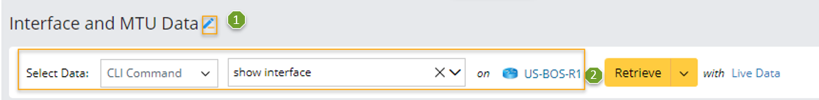 - Define the settings for collecting CLI Command data. In this example, select "CLI Command" of "show interface" as the retrieved command data and select the device US-BOS-R1 to retrieve data on it.