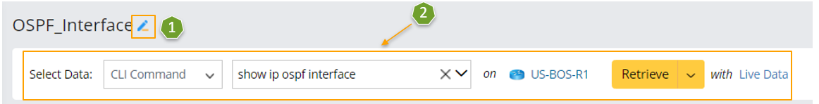 - Define the settings for collecting CLI Command data. In this example, select "CLI Command" of "show ip ospf interface" as the retrieved data and select the device US-BOS-R1 to retrieve data on it.