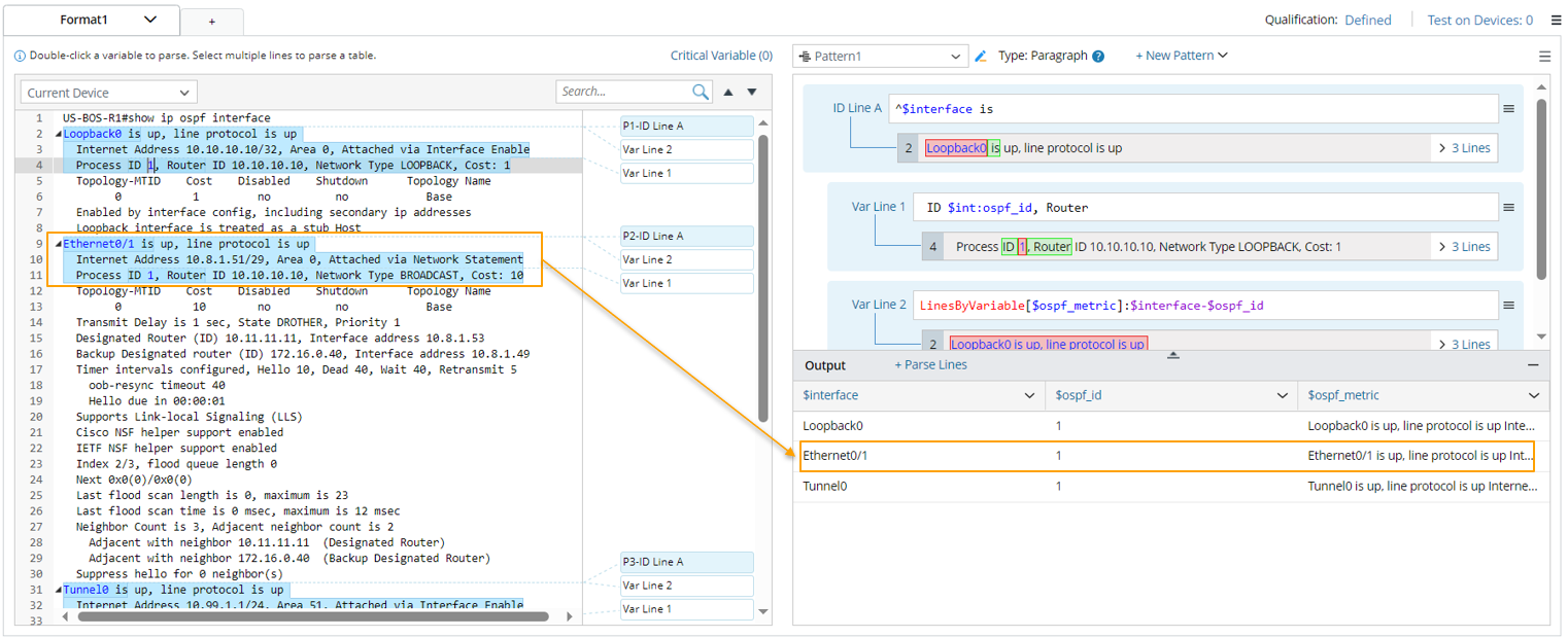 - Click "Loopback0" in line 2 to parse the variables “$interface”, then continue to double-click "1" in line 4 to continue to parser variable “$ospf_id” in Auto Parser mode.
