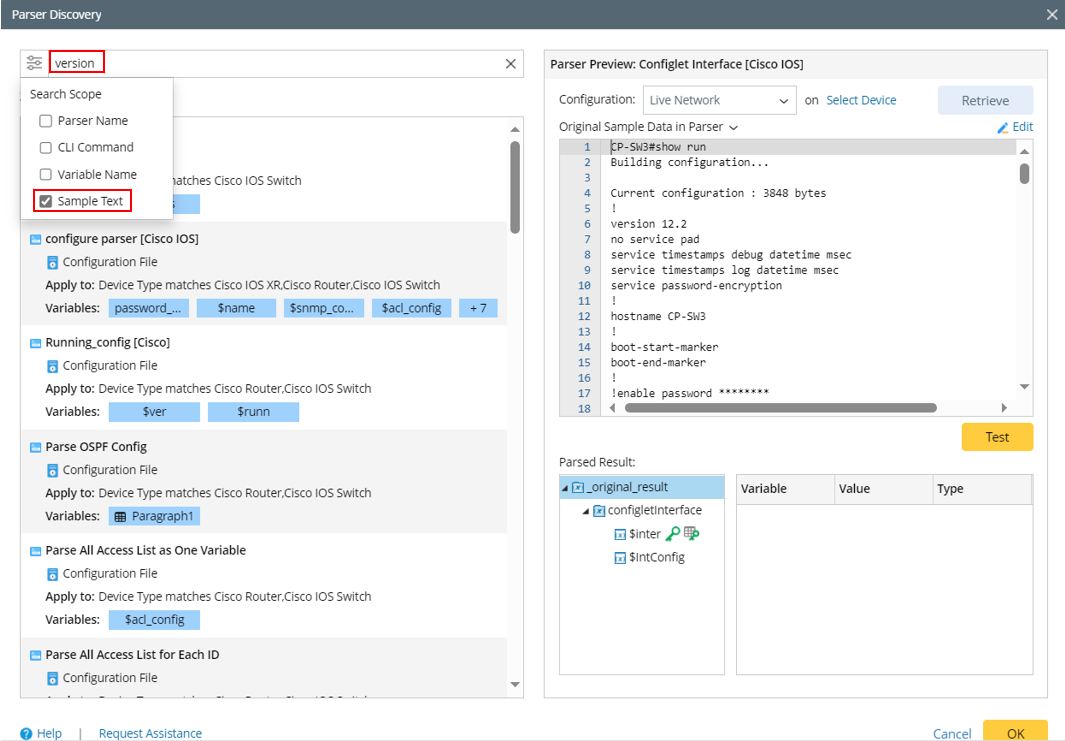 - Search for a Configuration Parser:If you want to search for a configuration parser, you can set Sample Data (Text) as the search scope, and type keywords in the configuration file (e.g., version) to find your parser.