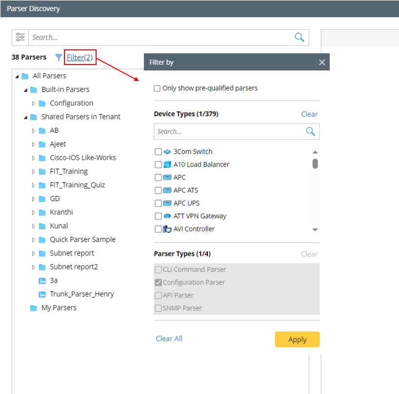 Filter Parsers by Device Types and Parser Types