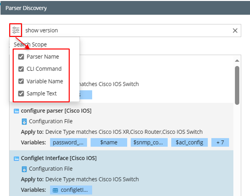 If you want to search for a CLI command parser, you can set the CLI command as search scope, and type keywords in the CLI command (e.g., show interface) to find your parser.