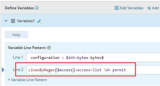 - Only the variables defined in the previous line patterns can be used in this pattern. The variables defined in the pattern of matching lines by keyword (LinesByKeyword) and matching lines by variable (LinesByVariable) are allowed.