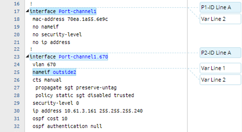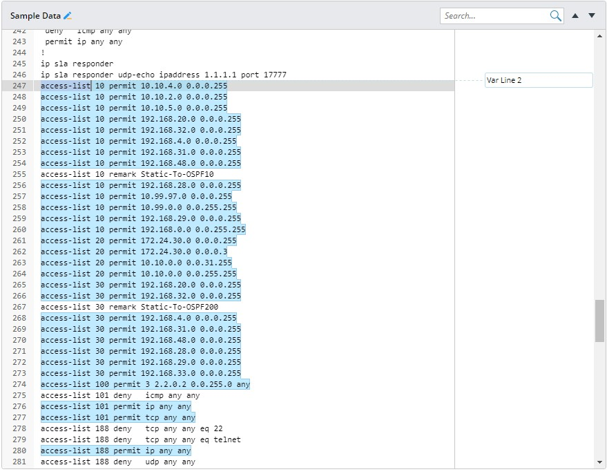 Note: When a variable defined in a simple line pattern does not include a specific data type, e.g., $var1, its variable type will be auto-assigned depending on the data type of its parsed values. The system provides this auto-validation mechanism to avoid a numerical value (integer/float/double-type) being mistakenly defined and parsed as a string, which cannot be compared or processed as numbers in further Network Intent Automation.