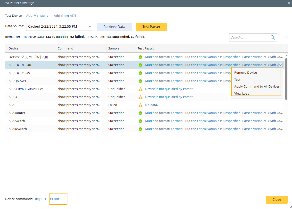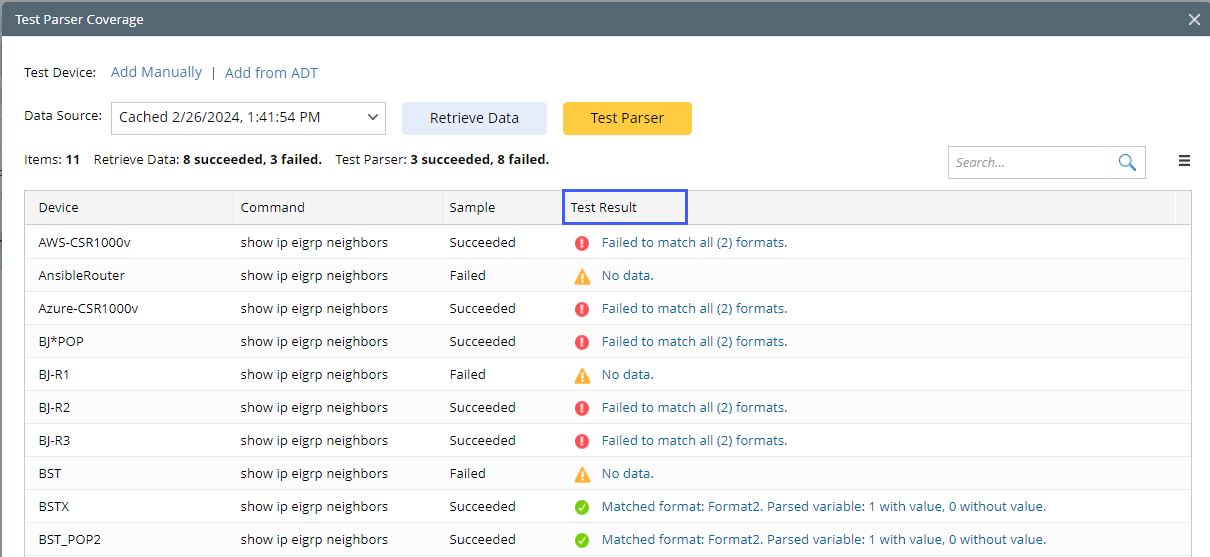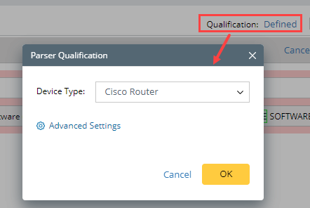 The format with critical variable is matched, and all the critical variables can be parsed. Device is not qualified by Parser. The device does not belong to the selected device type in the Qualification.