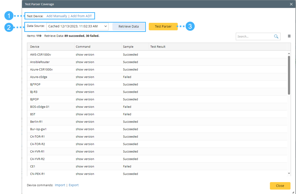 You can use Test Parser feature to ensure the parser can work as expected not only on the current device, but also on other devices before being used in other automation features, such as Intent/Intent Template, Preventive Automation, Runbook CLI node, etc., to increase the successful rates of these automations.