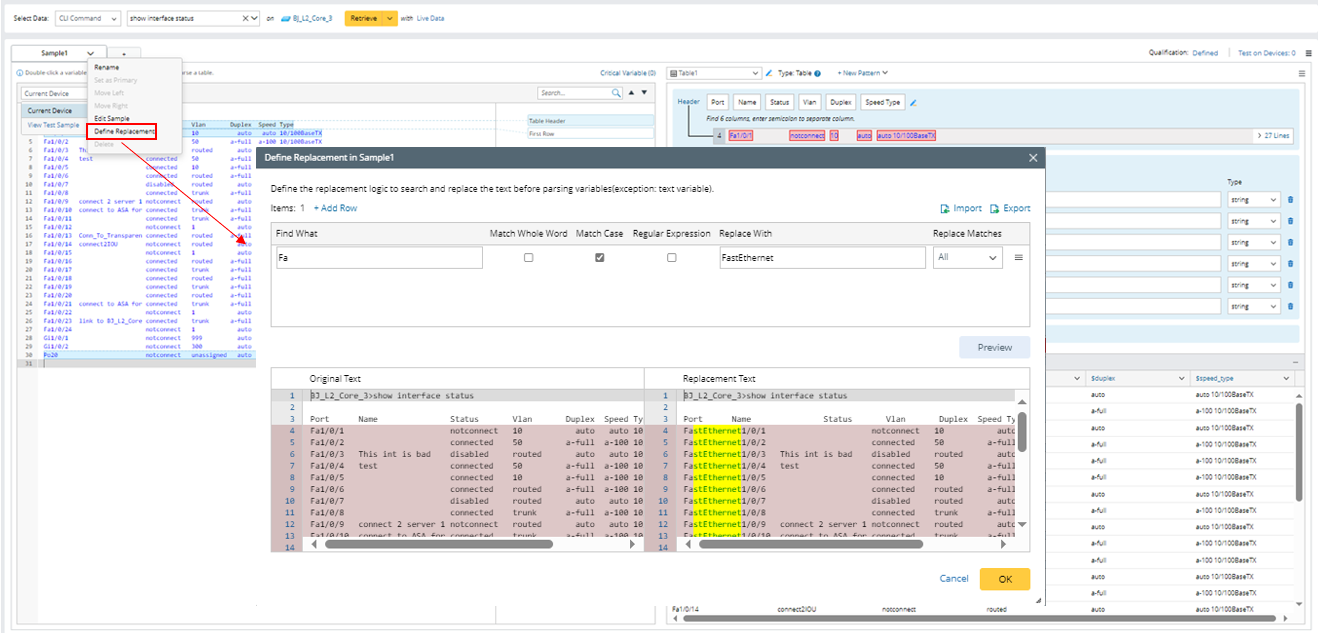 - Click +Add Row, then set to replace Fa with FastEthernet. The meanings of the options are described below: