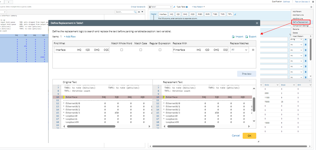When a device command output looks similar to a standard table format but only misses a table header line, you can define text replacement to replace the line of text ahead of the table data with a customized table header line. This twist allows you to continue to define a Table Parser to parse the table data. - Fill Up Table Headers