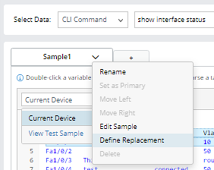 - Retrieve command data “show interface status” on the device BJ_L2_Core_3, then select several lines from the sample text to parser table. The interface name is short name in the parsed results.