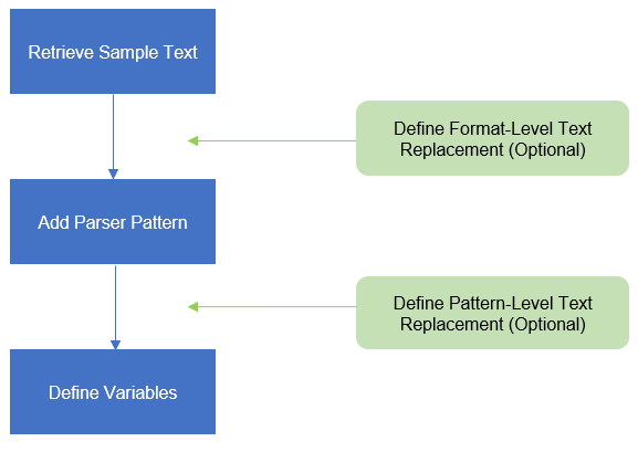 - Pattern level: In one format, you can define several patterns. Text replacement can be defined for one pattern. The system will search and replace a string in the given range of text that has been matched by a specific Parser’s definition in this pattern.