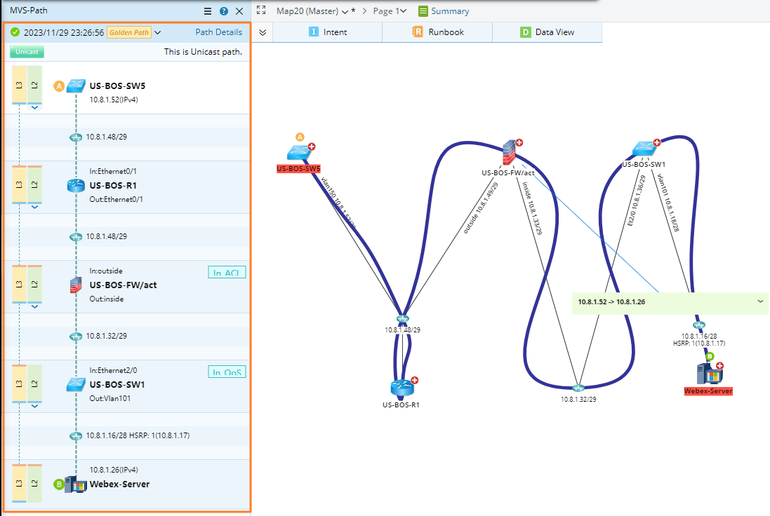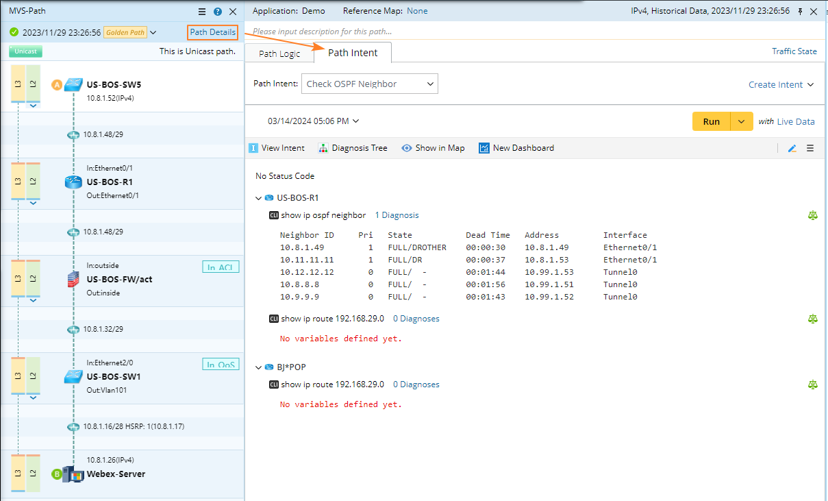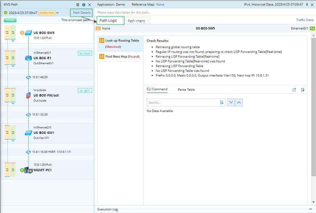 - Path Logic Pane: Show the data used in Path Discovery, including the device information, the interface information, and the execution log (which is fully displayed). You can write notes for each path hop.