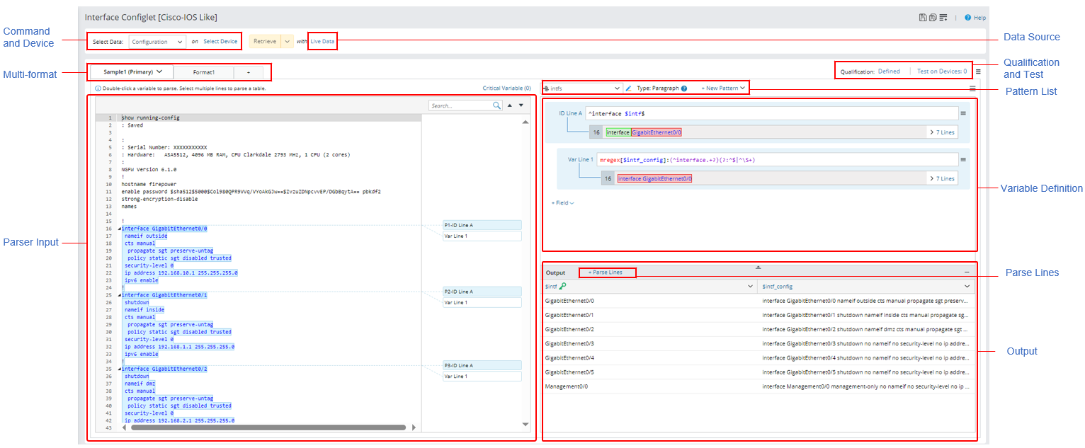 - Select the data source in the Data Source area and retrieve sample text from command output or device configuration in the Command and Device area. The retrieved sample text of command output or device configuration is displayed in the Parser Input area.